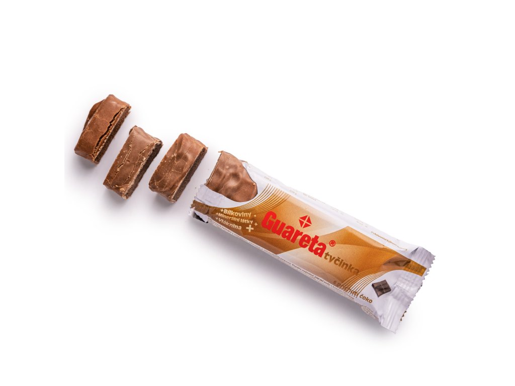Proteinová tyčinka s vlákninou, vitaminy a minerálními látkami.