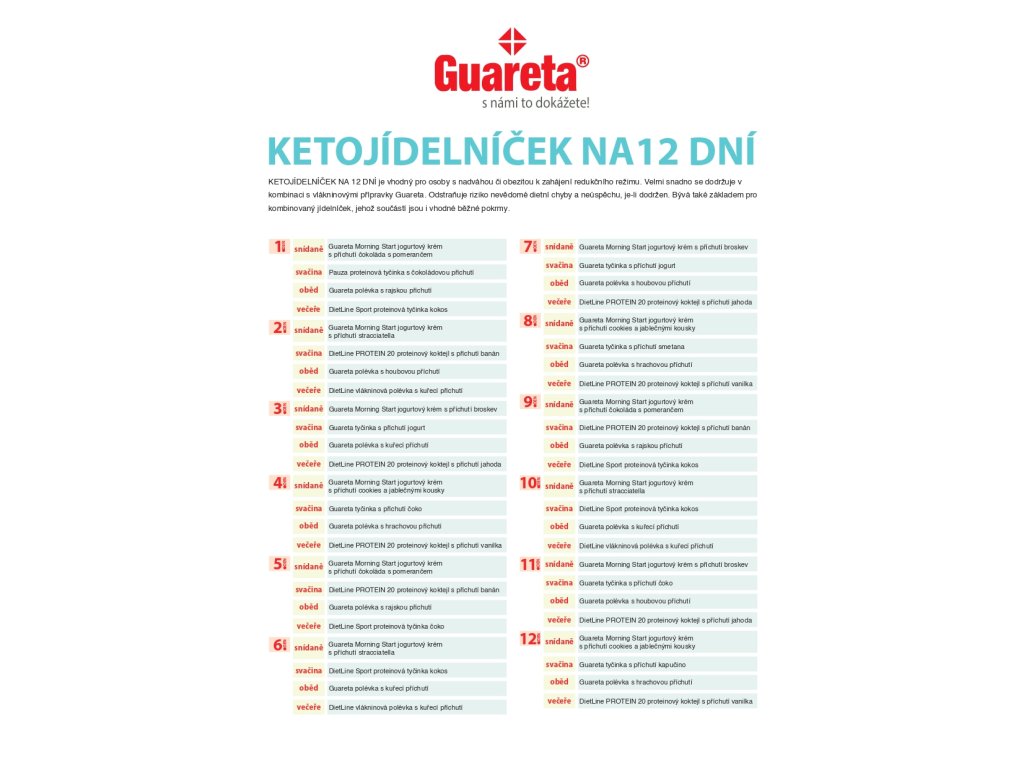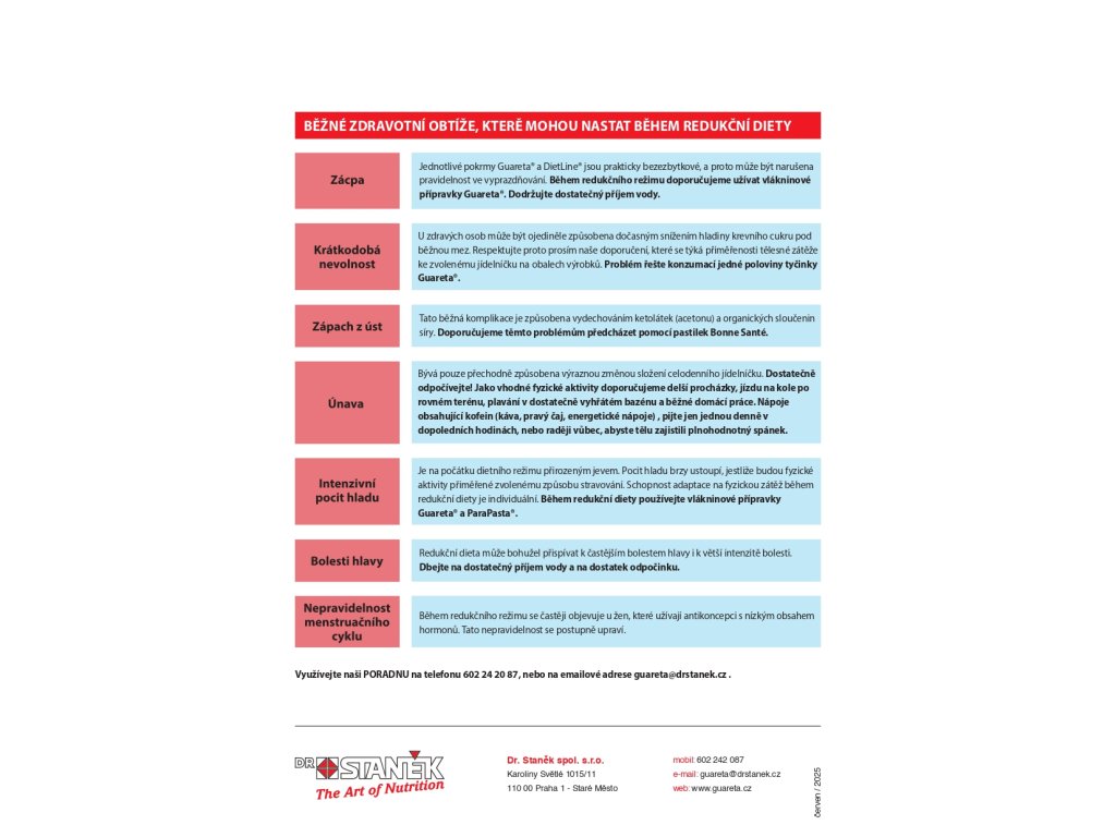 Zácpa | jednotlivé pokrmy Guareta® a DietLine® jsou prakticky bezezbytkové, a proto může být narušena pravidelnost vyprazdňování. Doporučujeme během plánu užívat vlákninové přípravky Guareta®. Dodržujte zároveň dostatečný příjem vody. |